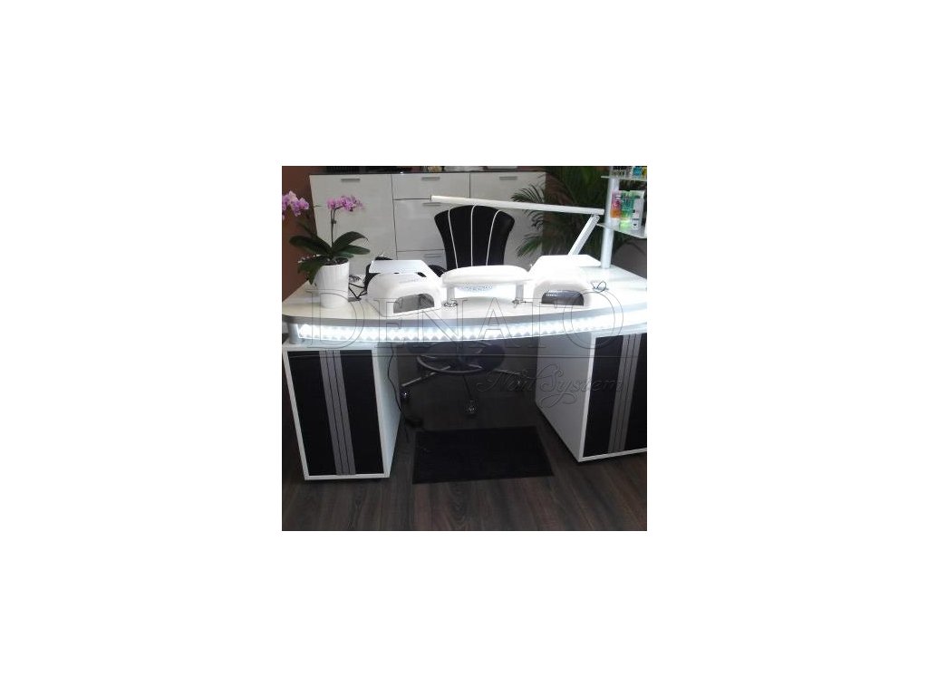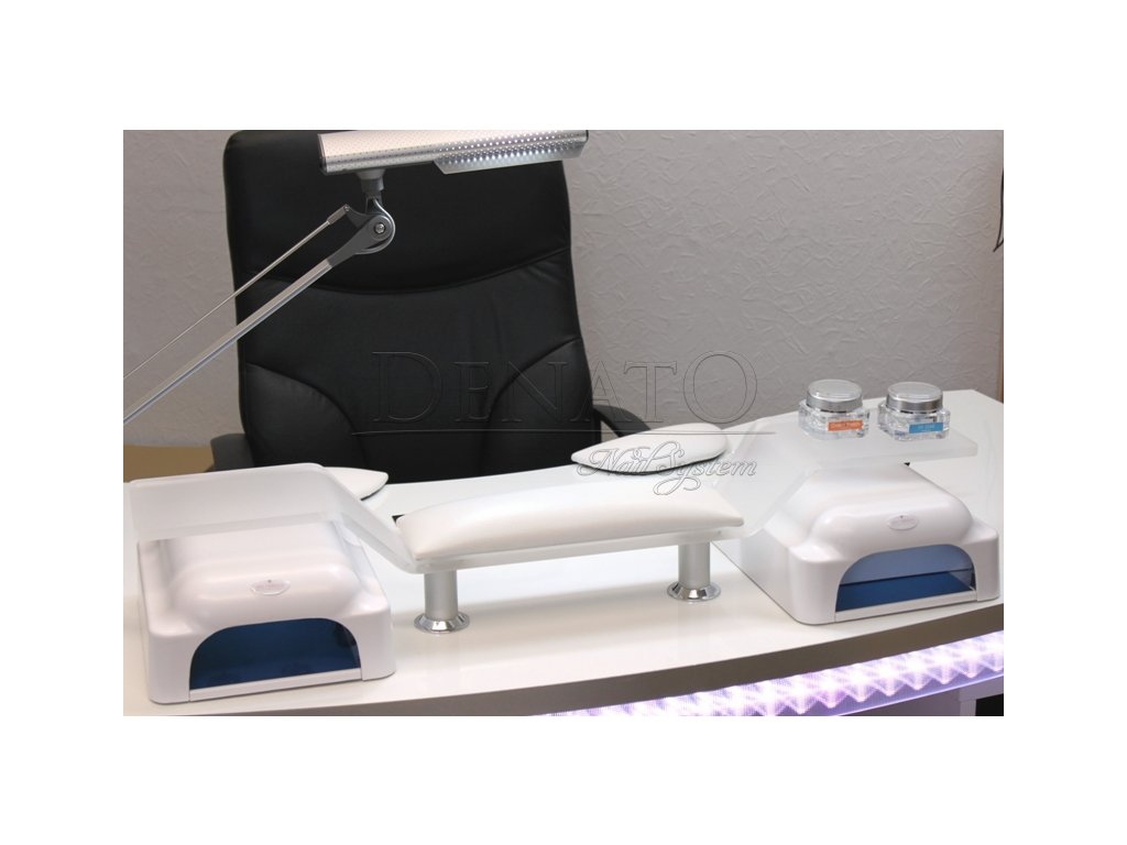 The main part of the hand rest remains the same – handcrafted, softly padded, and covered with synthetic leather that is washable, disinfectable, and pleasant to the touch. Its ergonomic height ensures the client’s hands are comfortably positioned while reducing neck and back strain for the nail technician.